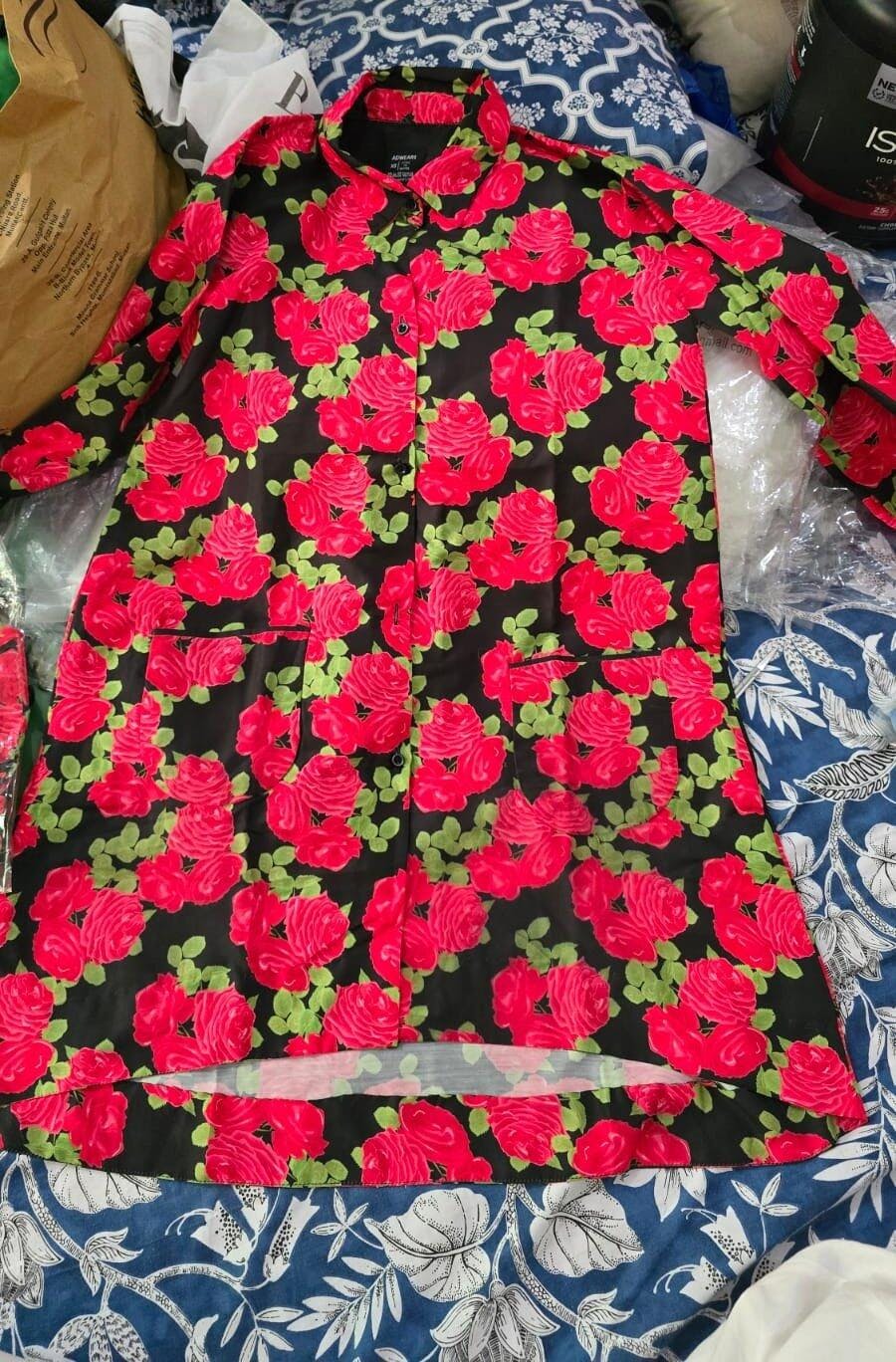 This black button down top made with Premium Cambric Fabric in rosy print features pockets and high low